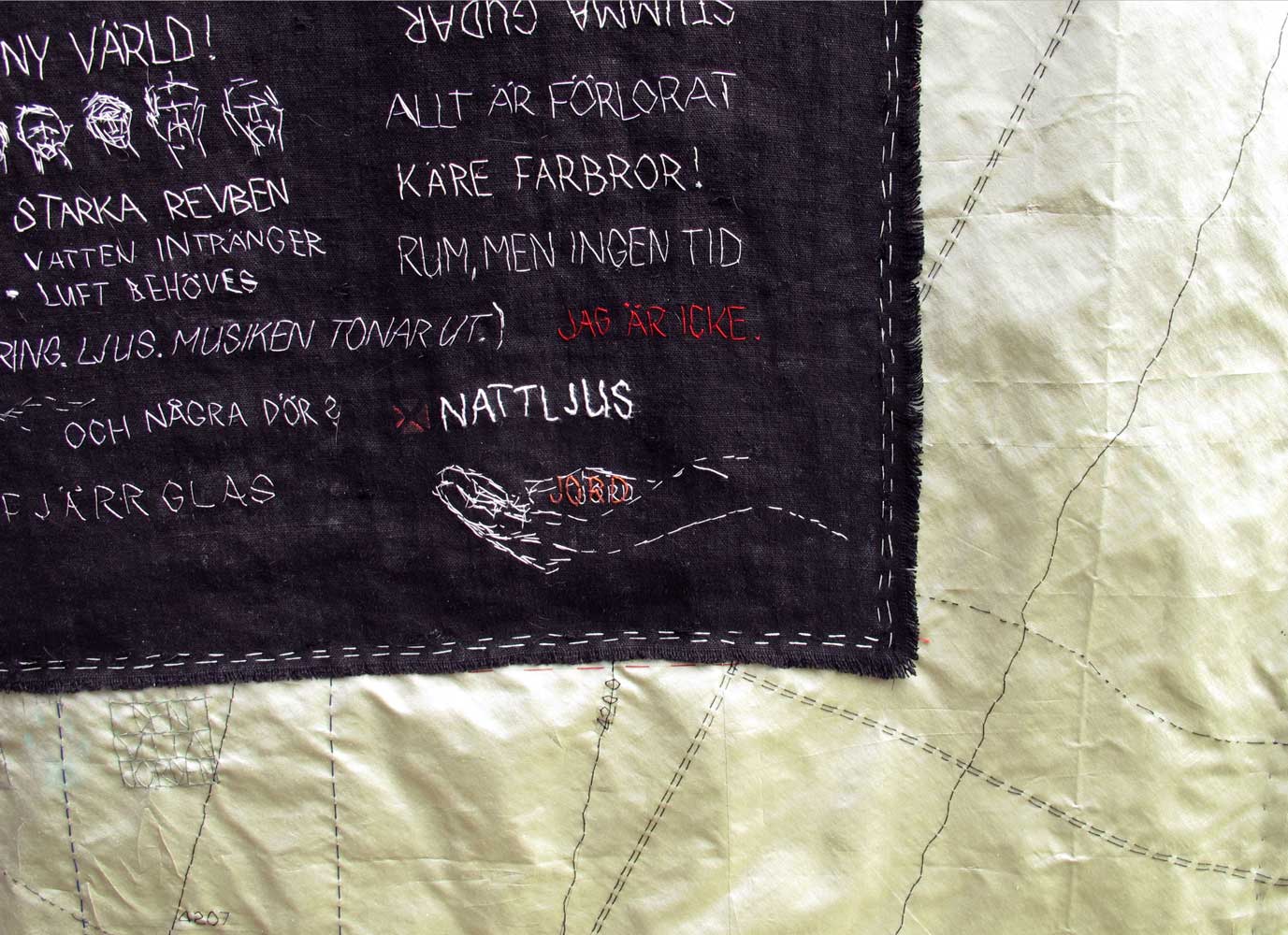 Ord och begrepp ur texten broderade på svart linne och monterade på isgrönt frasande skimrande siden. På sidenramen finns en sydd ritning över ett övergivet flygfält i Arizona. Jag höll Lotta Lotass underrättad under arbetet och hon skrev: ... tusen sinom tusen tack! Det är tveklöst den finaste uppskattning boken har fått. Jag gläder mig oupphörligt.