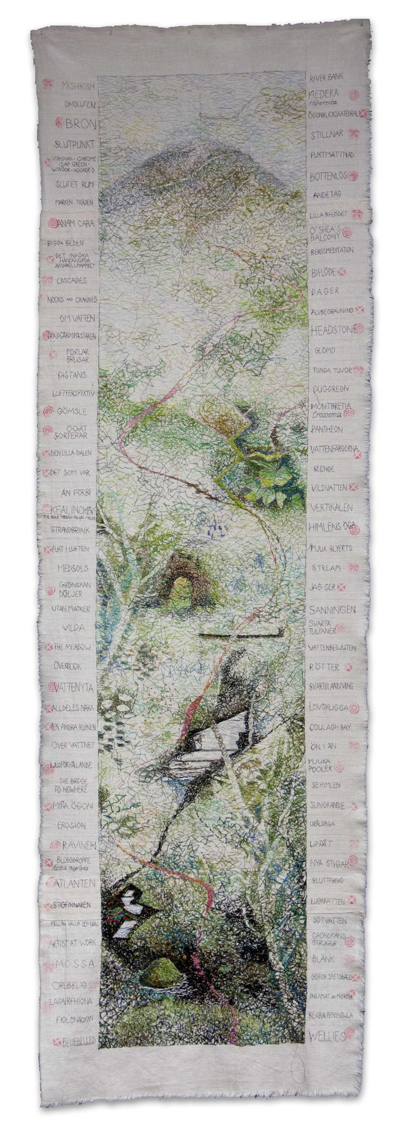 Jag var på Irland några veckor 2002 och 2003, på Beara Peninsula längst ner i sydväst. Varje dag vandrade jag runt och målade nere i en ravin där Kealincha River rinner ut i Atlanten. Det blev många bilder, 56 stycken, och en hel del textfragment. Jag har aldrig kunnat släppa den, ravinen har funnits i mig sen dess och jag har arbetat med minnet av den i olika fomer genom åren, senast i ett hundradagars broderi.