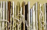 Eleverna gör egna pilliga exlibris med fina material, som jag har med mig: patinerat papper, akvarellfärg i blått, guld och jordtoner, bra penslar, och vattenburkar med guldbotten. När exlibrisen är färdiga visar vi dem på svart sammet och tittar på dem tillsammans. Eleverna berättar om sina symboler och då visar de ofta sidor som kamraterna inte känner till.
